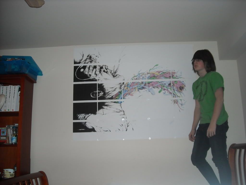 Okay, Rasterbation has nothing to do with the word that sounds like it. Rasterbating is the method of making wall sized posters by printing sections on individual sheets, then taping the together. I've been two rasterbations so far, both were a little less than half the size of my wall. Since I'm out of ink and it costs $50 just to replace it, and a whole wall would take up probably 3 carts. of ink, I'm going to do Fedex Kinkos and have them print it all out. My only question is, what do I really want to see on my ceiling (the whole ceiling) every day.